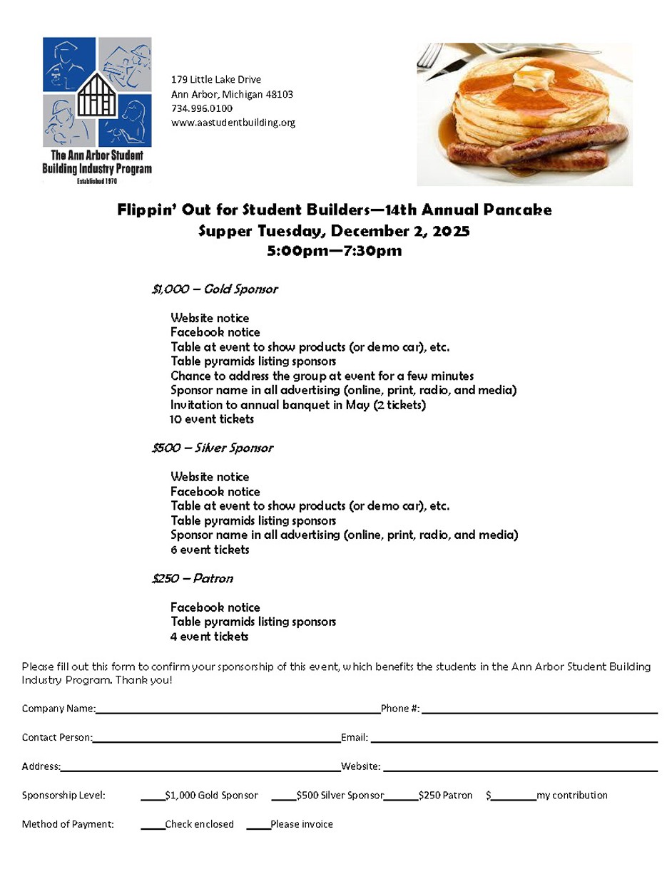 The Ann Arbor Student Building Industry Program provides Ann Arbor's high school students with a unique learning experience. Through the actual construction of a new home, from raw land to finished product, students learn the importance of math skills, architectural dimension, job satisfaction, along with teamwork, responsibility and dependability. Upon completion of the program, students have an awareness of the many opportunities and benefits of the construction industry and related fields.
