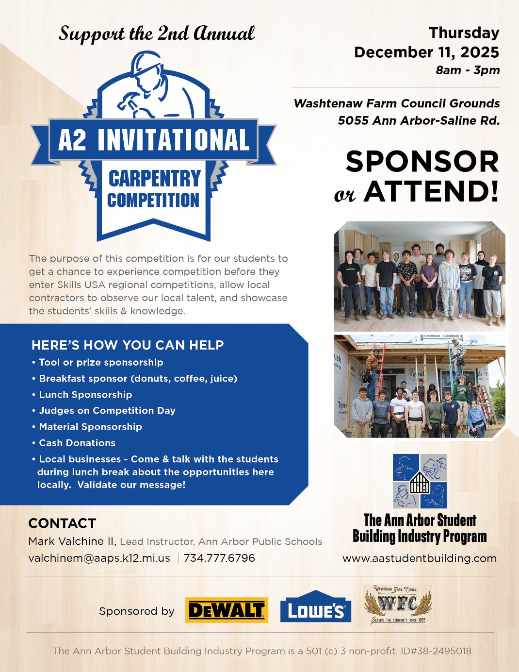 The Ann Arbor Student Building Industry Program provides Ann Arbor's high school students with a unique learning experience. Through the actual construction of a new home, from raw land to finished product, students learn the importance of math skills, architectural dimension, job satisfaction, along with teamwork, responsibility and dependability. Upon completion of the program, students have an awareness of the many opportunities and benefits of the construction industry and related fields.